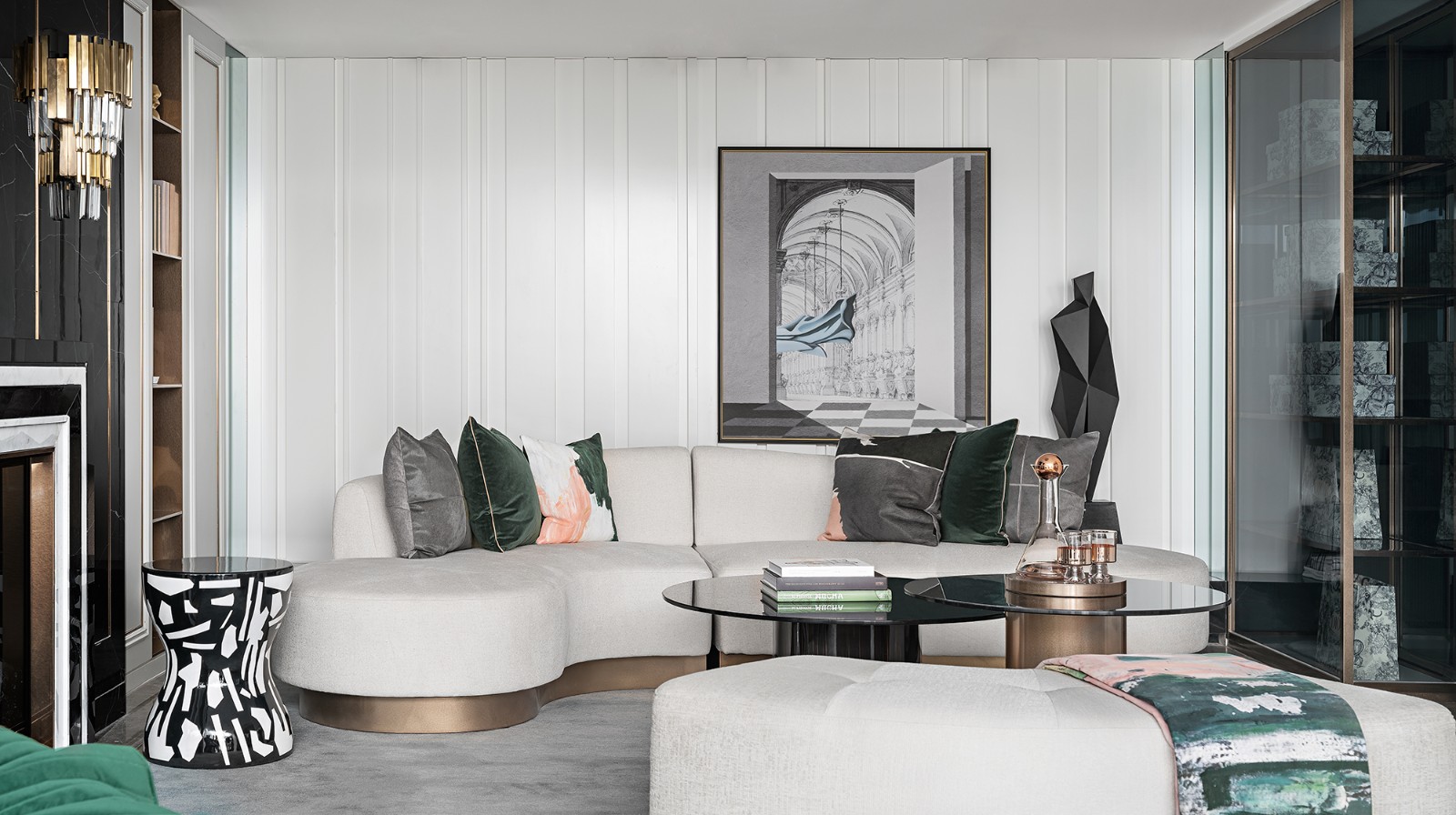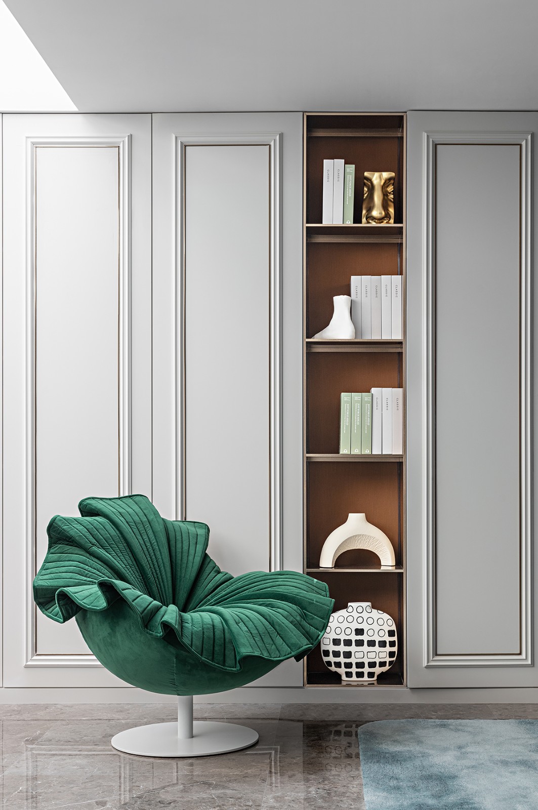 起居室设计更加柔软,壁炉的加入汇聚空间灵魂,搭配绿色的单椅与现代艺术挂画,在不规则沙发的搭配下,呈现放松的感觉。