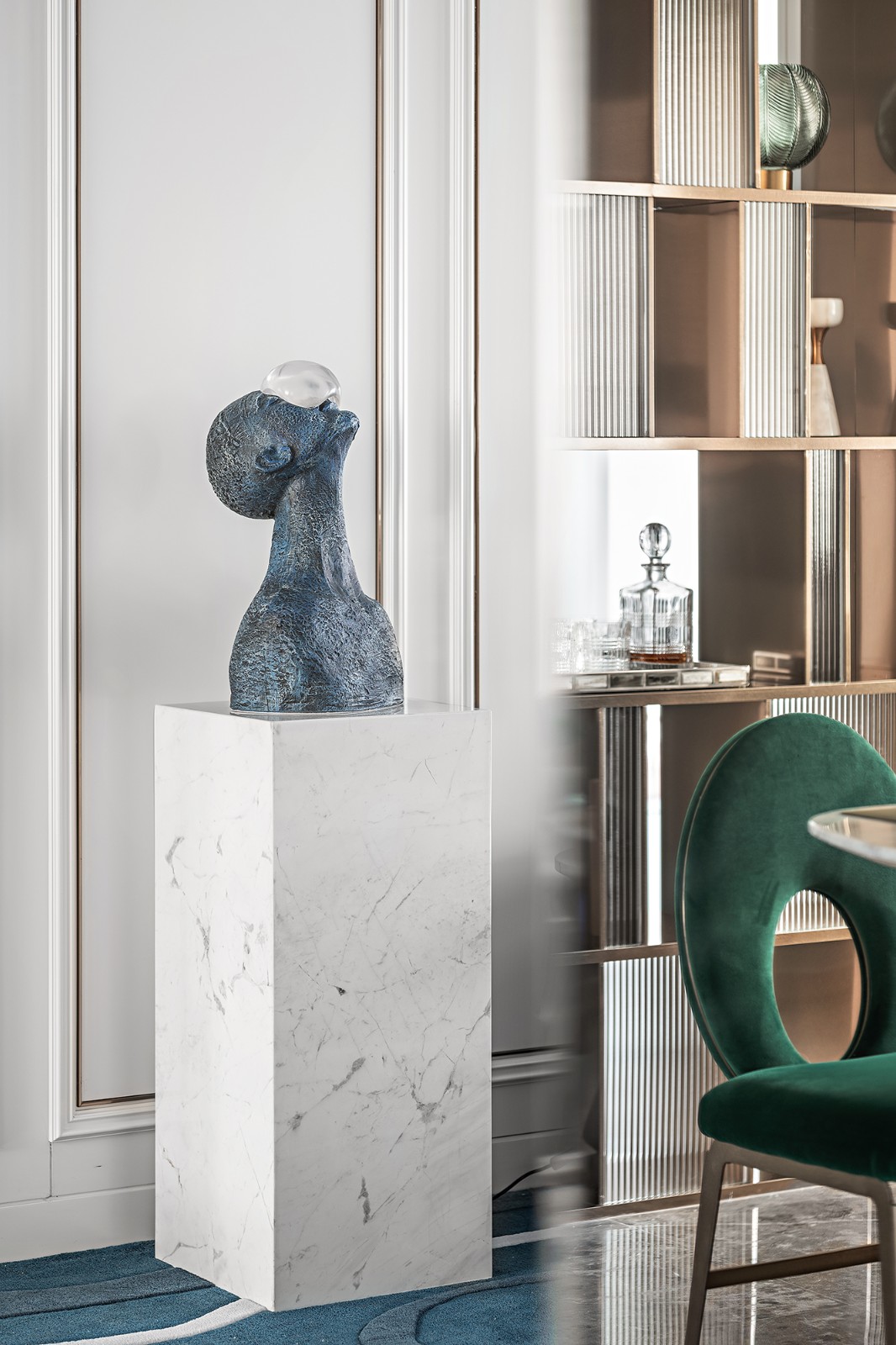 精致的餐具,优雅的摆件,蓝色高级的餐巾都彰显着空间的气度。