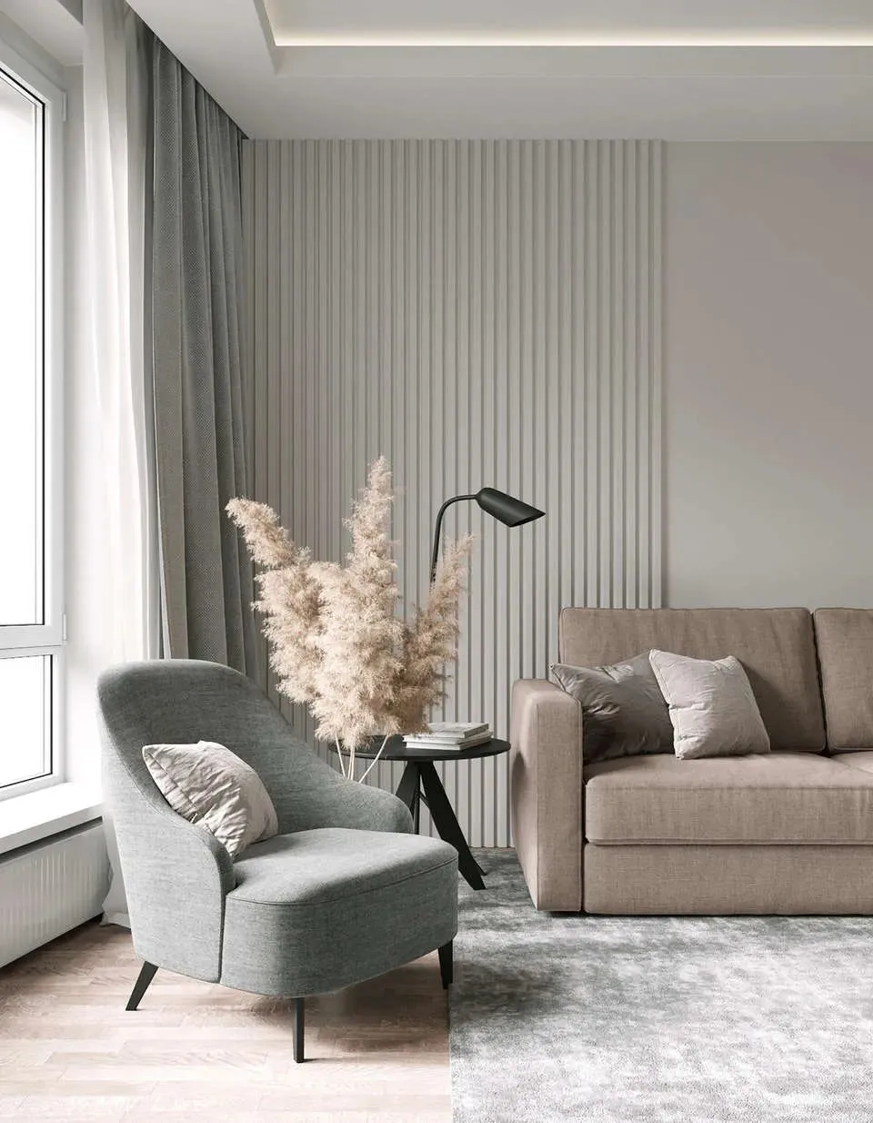客厅色调以浅灰、卡其和白色为主,低纯度的色彩不仅容易搭配,还能让空间显得温馨且宁静。