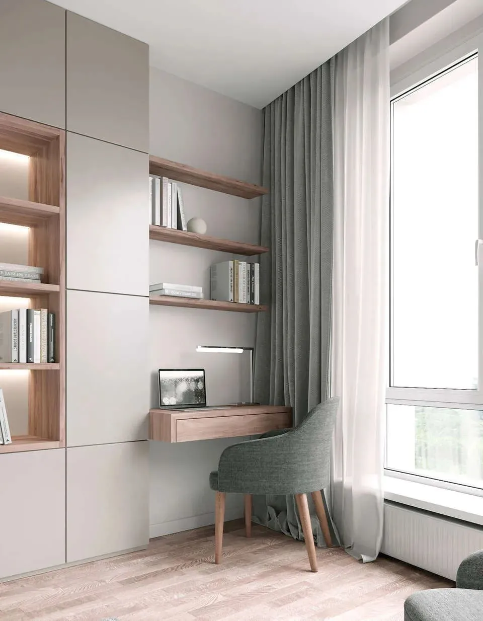 男主人平时有在家办公的需求,故设计师在明亮的客厅窗边打造了小型办公区。